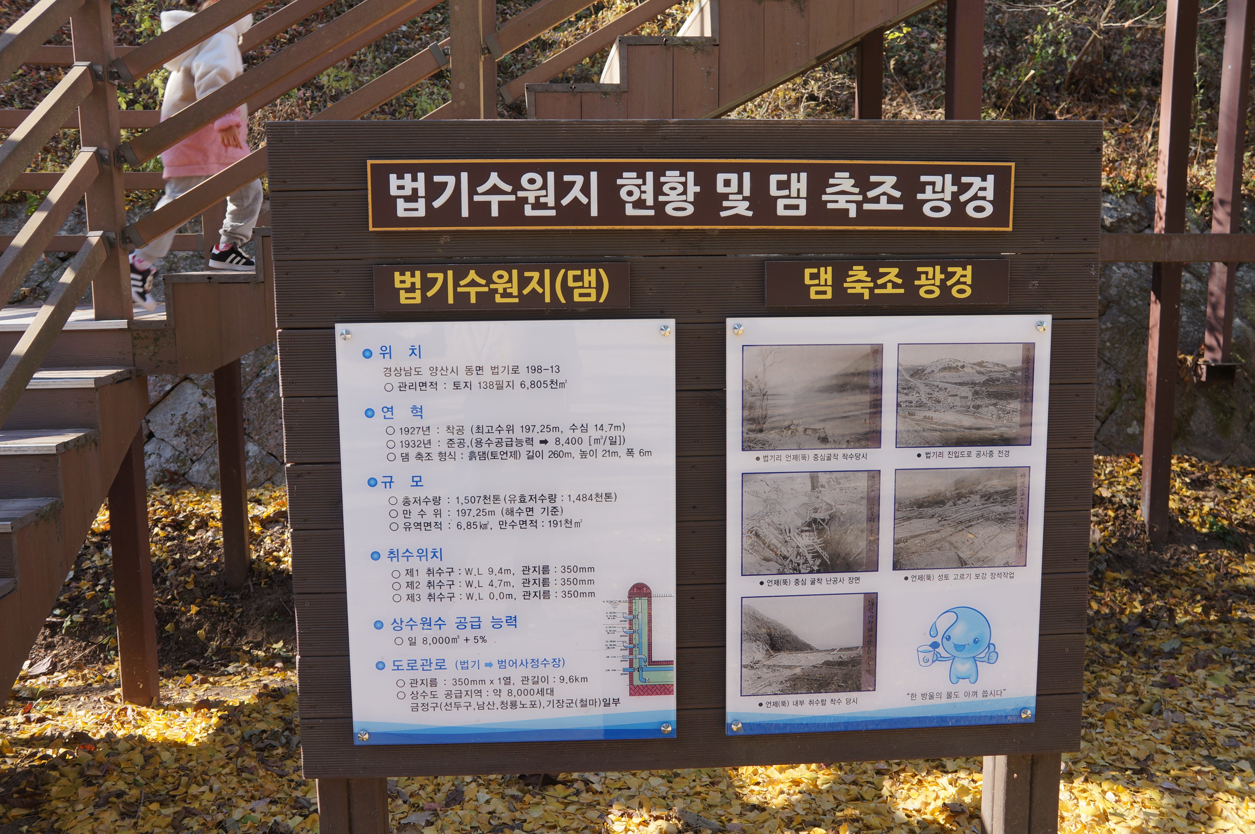 법기수원지의 댐은 흙으로 만들어져 있으며 일제강점기 때 5년간(1927~1932)에 걸쳐 건설되었습니다. 1927년 12월 20일 당시 중앙지인 동아일보에 양산 법기리 상수원지 기공식 소식과 수몰지 주민의 이주대책 등이 거론된 기사가 크게 실렸다고 합니다. 그 당시 시대적인 상황에서는 국가적 대규모 토목공사였던 것을 말해준다고 할 수 있겠습니다. 1932년 법기수원지의 완공 후부터 근래인 2011년도까지 한 번도 개방된적이 없다가 2011년 7월 15일에 일부에 한해 개방함으로써 79년 만에 일반인들에게 드러나게 된 곳입니다. 비록 일제의 주도하에 댐이 건설되었지만 댐 건설의 주역은 당시 강제동원되었던 우리의 선조들입니다. 이제 근대문화유산이 된 법기 수원지는 우리가 아끼고 보살펴 역사적 교훈의 본보기가 되는 유산으로 후손에게 물려주어야 하겠습니다.