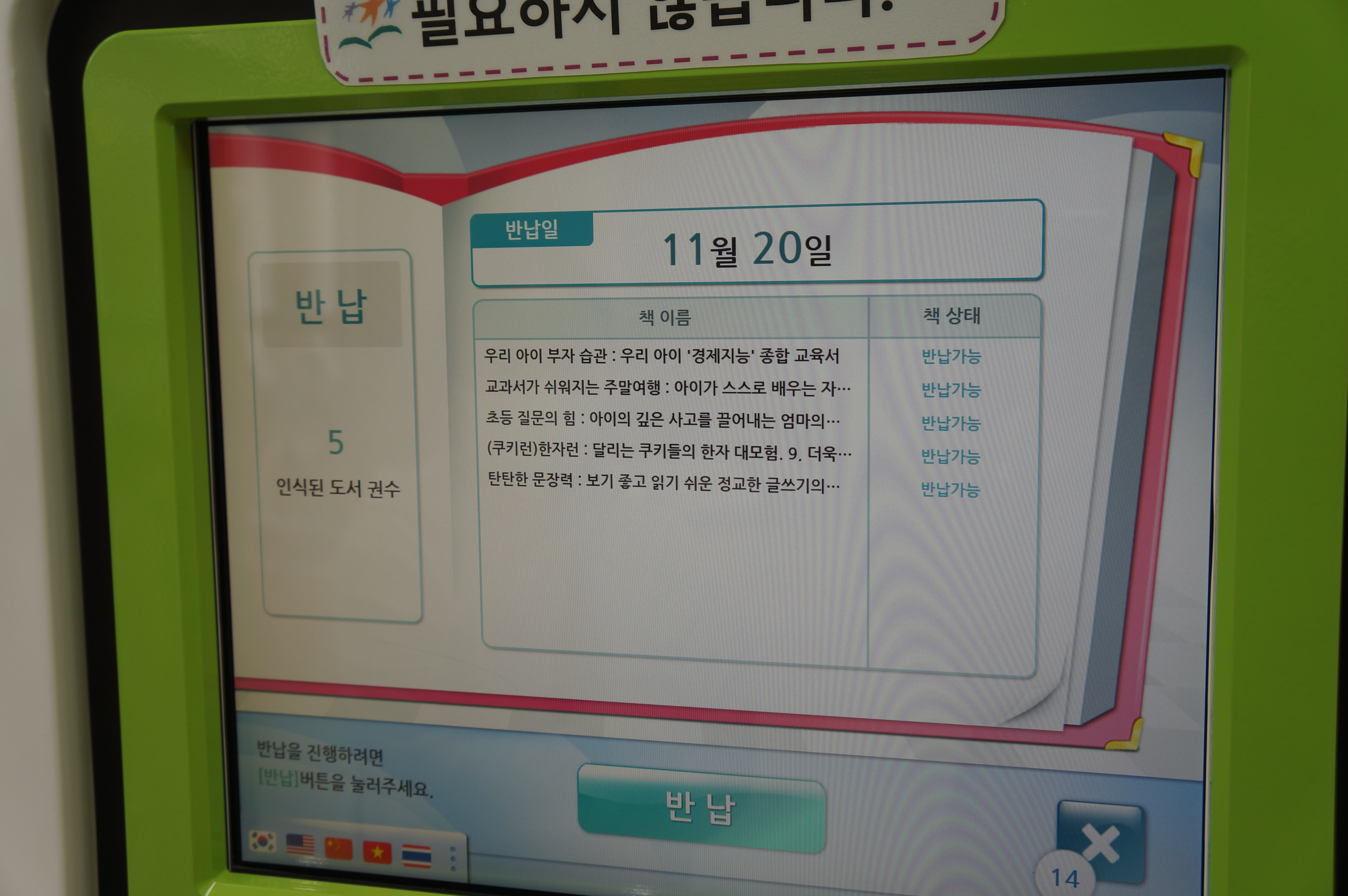 대여를 하거나 반납을 하는 경우 책을 한번에 올려 놓으면 한번에 인식을 합니다.