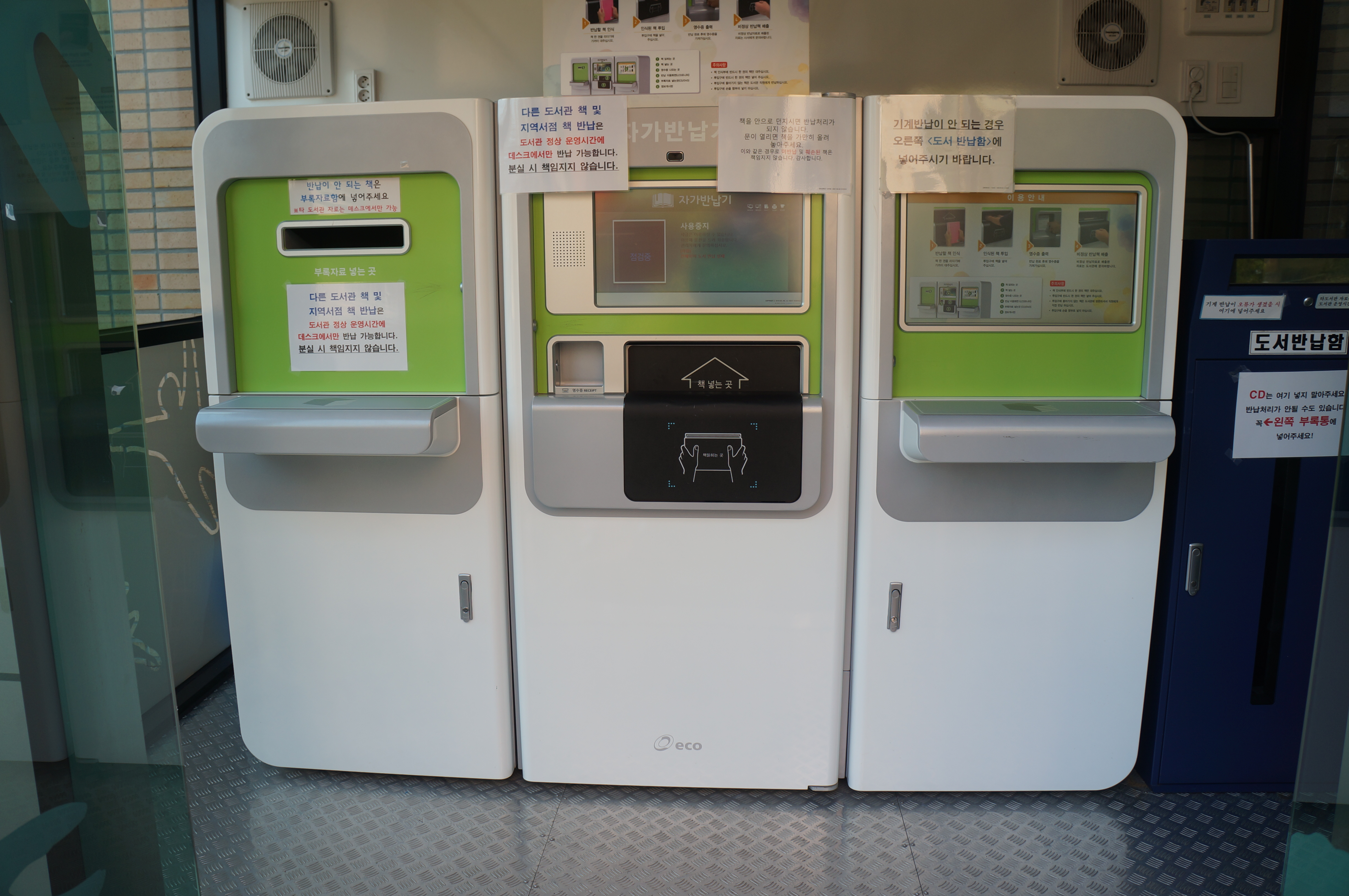 평일에 도서관 시간을 맞추기 힘든 직장인들을 위한 도서 무인 반납기가 도서관 입구에 위치하고 있습니다.
